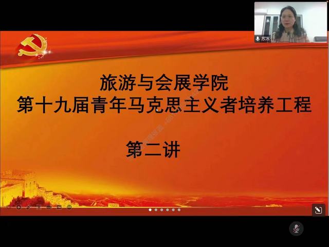 11月16日,旅游與會展學院第十九屆青年馬克思主義者培養工程第二講在線上順利召開,旅游與會展學院團委邀請我校馬克思主義學院蘇冰教授為第十九屆青年馬克思主義者培養工程全體學員上課。