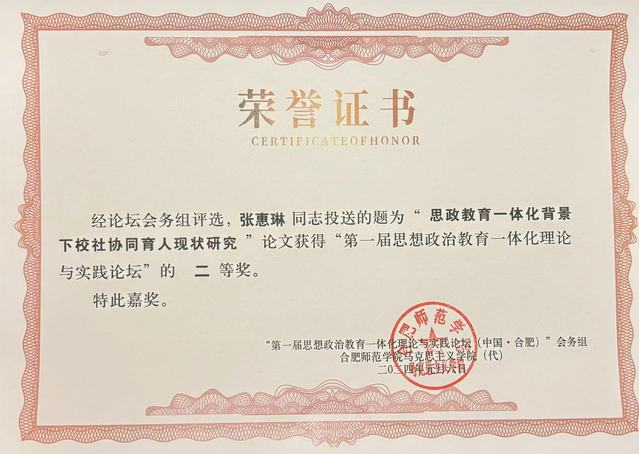 我院教師在大中小學思想政治教育一體化論壇上獲獎 1月6日,第一屆“大中小學思想政治教育一體化”理論與實踐論壇在合肥舉行。我院教師張惠琳博士受邀參會,所提交論文榮獲二等獎。