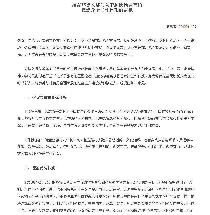 教育部等八部門關于加快構建高校思想政治工作體系的意見(教思政〔2020〕1號)