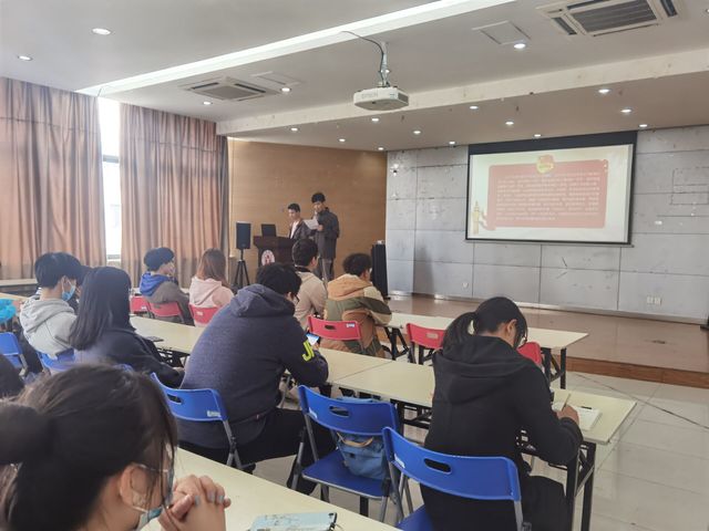 會議于下午2時正式開始。會議第一項全體唱團歌。接著由學生社團管理辦公室李先印為全場人員講訴開展主題團日的重要性。指出開展“齊赴初心,共迎百年”主題團日活動是為了繼承和弘揚黨的光榮傳統和優秀作風,提高各級團組織的凝聚力、號召力和戰斗力,增強廣大團員的光榮感、責任感和使命感,帶領支部成員更加深刻了解黨的發展史,響應黨的號召,堅定理想信念,增強服務意識,改進工作作風,同時團結支部成員,擴大支部影響力,加強支部成員學習黨史的積極性和主動性,提升成員的整體政治理論素養。之后李先印講述了團日活動的要求,首先是展開黨史學習,放了有關黨史學習的視頻。全場人員聚精會神的觀看著,體會著黨發展的艱辛與取得的輝煌成就其次是參觀紅色教育基地,并提倡以“云旅游”的形式進行,播放了有關紅色教育云旅游小視頻,以新型方式帶領參會人員深入了解黨史。最后是團支部活動的開展,把增強“四個意識”、堅定“四個自信”、做到“兩個維護”貫穿于各類活動之中。在介紹完活動材料的領取與評獎后,會議正式結束。