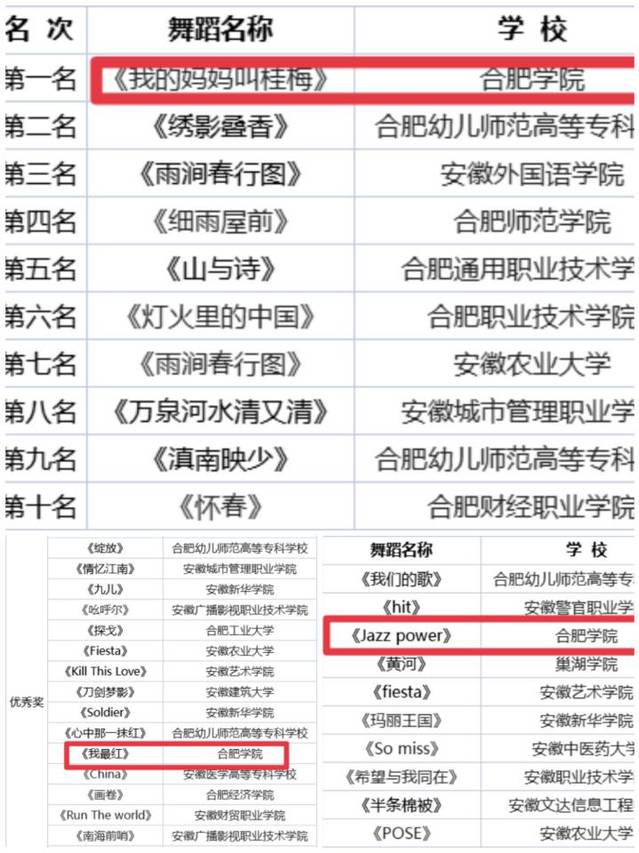 合肥大學生文化藝術季校園比賽每年舉辦一次,為在肥高校和大學生提供了展示文化建設成果的大舞臺。2021年活動主題為“百年恰風華·奮斗正青春”,包括合肥大學生校園舞蹈大賽、合肥大學生校園演講大賽及合肥大學生校園歌手大賽三大類。其中,我校報送的舞蹈作品《我的媽媽叫桂梅》獲中國舞組第一名,《Jazz power》獲現代舞組第三名,《我最紅》獲現代舞組優秀獎;徐萌萌獲演講大賽第七名,周思慧、肖博文、王雪燕獲優秀獎;徐思揚獲校園歌手大賽優秀獎