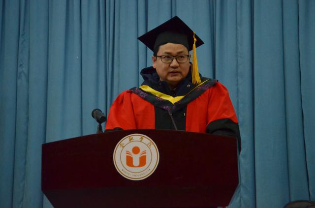 畢業典禮在莊嚴的國歌聲中開始。伍德勤宣讀了“關于授予2018屆環境工程領域謝紅燕等24名研究生工程碩士學位的決定”。在熱烈的掌聲中,劉建中代表我校,向順利畢業的2018屆畢業生表示熱烈的祝賀,向校內外導師以及支持我校研究生教育的所有機構和人員致以衷心的感謝。他還在致辭中回顧了我校教育改革所取得的成績以及研究生教育改革的成就,同時也向即將開始人生新起點的同學們提出“追求卓越,成就自我”的殷切希望和在未來的人生道路上要“創新思想、志存高遠勤奮努力、主宰未來常懷感恩、尊重友情”的建議。