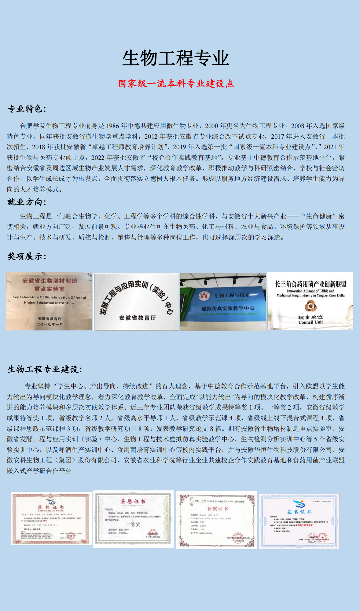 培養目標及特色:本專業培養德智體美勞全面發展,適應安徽省及周邊地區經濟建設和社會發展需求,具備數學與自然科學、生物學和工程學基本知識,掌握生物產品大規模制造的科學原理,熟悉生物產品加工和設計的基礎理論和技能,能夠在生物、醫藥、材料、化工、環境和食品等領域從事生產制造、工藝設計、質量保證、技術研發、生產組織和運營管理等復雜工程實踐活動的應用型人才。生物工程專業引入歐盟以學生能力輸出為導向(OBE)的模塊化教學理念,結合安徽省生物產業人才需求,完成以能力輸出為導向的模塊化教育教學改革,構建產教融合的人才培養體系,校企協同培養學生工程實踐能力。