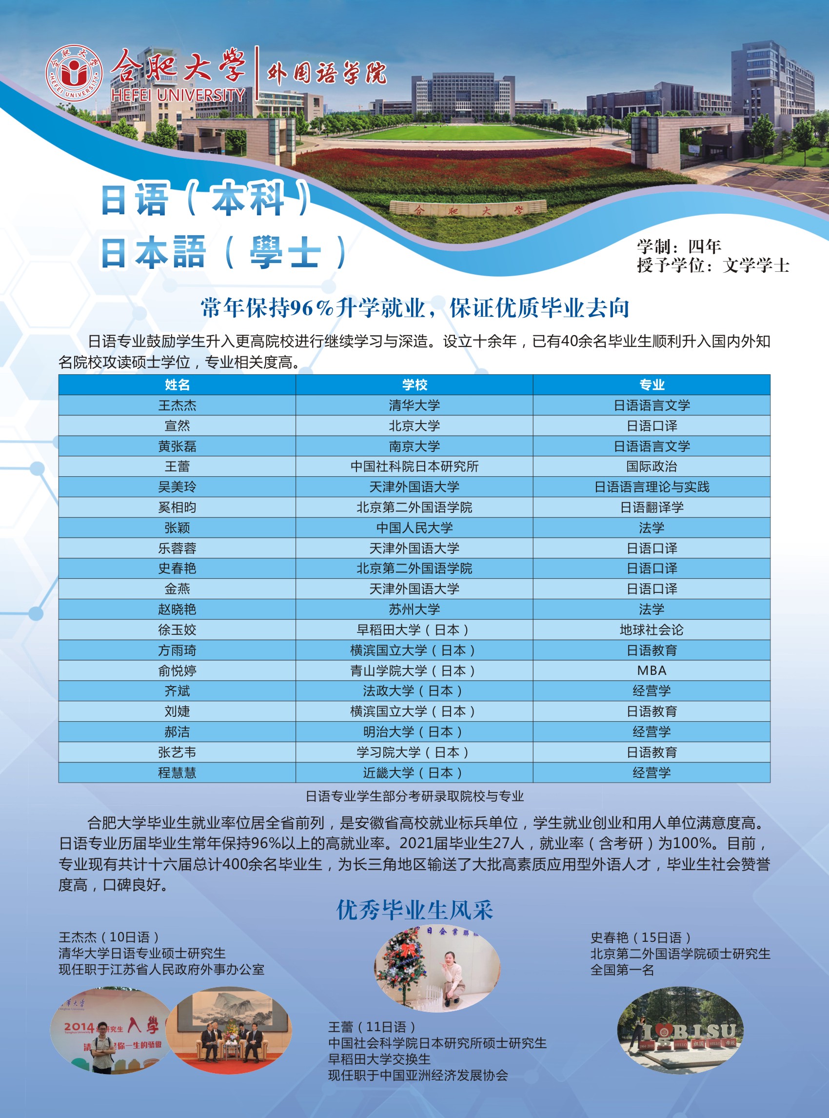 畢業生發展方向:畢業生可在企事業從事日語語言的語言服務、涉外翻譯、文化外宣、外貿銷售與咨詢、語言教育等相關工作;也可在中等教育學校、高等院校、科研機構和國家機關從事教學、科研和行政管理工作;也可繼續攻讀碩士學位研究生或出國深造。