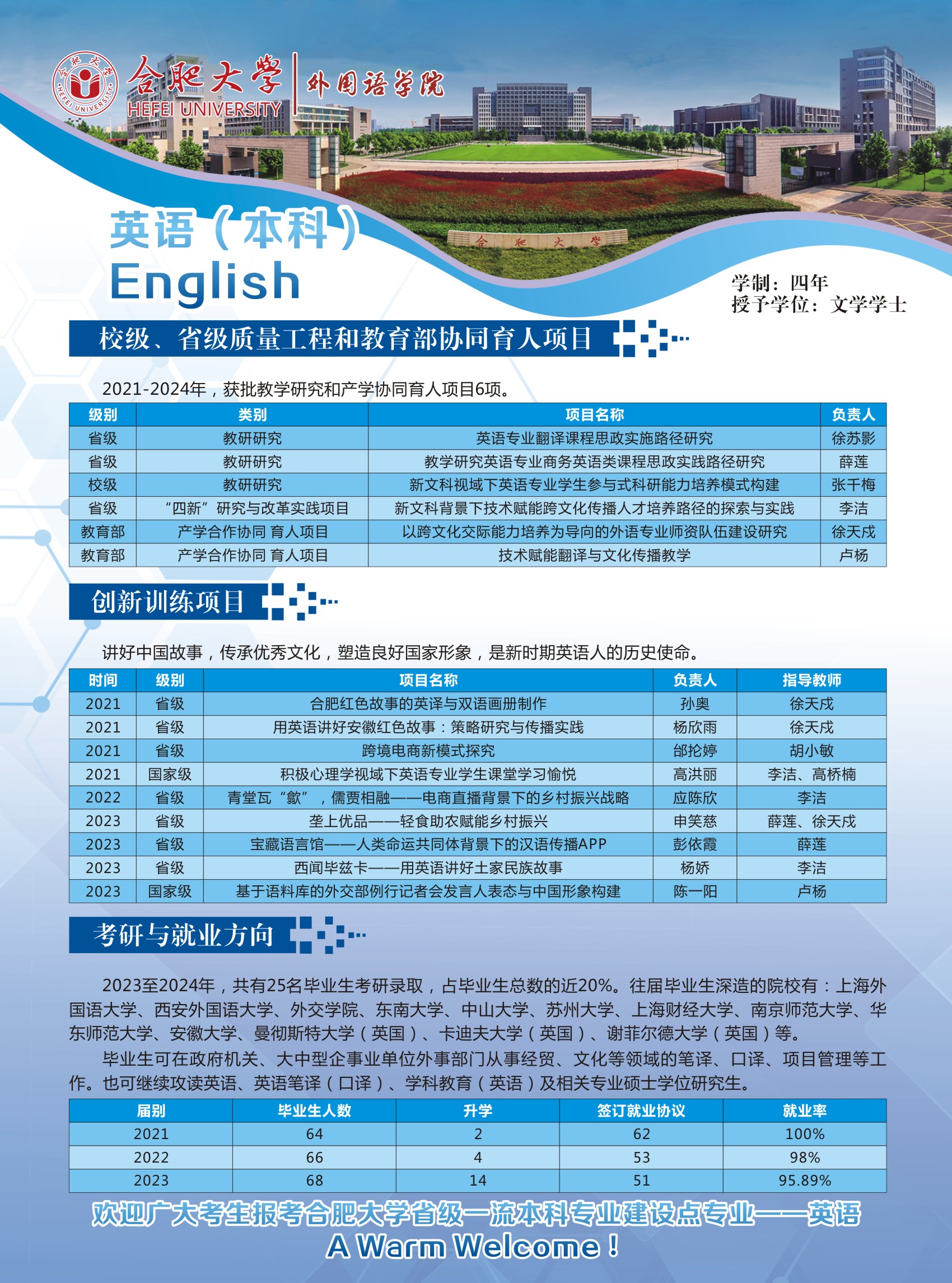 培養目標及特色:本專業培養德、智、體、美、勞全面發展,具有良好的綜合素質、扎實的英語語言基本功、較強的語言運用能力和應用翻譯能力、厚實的英語專業知識和必要的英語教育或商務英語專業知識與技能,能適應安徽、合肥與環巢湖地區區域經濟一體化發展和對外宣傳需要,可熟練使用英語從事涉外行業、語言服務行業和英語教育教學等項目管理、應用翻譯、教學等相關工作的具有較高跨文化傳播能力的復合型、應用型英語人才。本專業注重自主學習平臺建設,打造分層次的集中實踐和課內實踐教學體系,開拓應用能力培養的課內外輸出路徑,提升了學生講述中國故事、安徽和合肥外宣話語的寫作、演講、翻譯和闡釋能力。