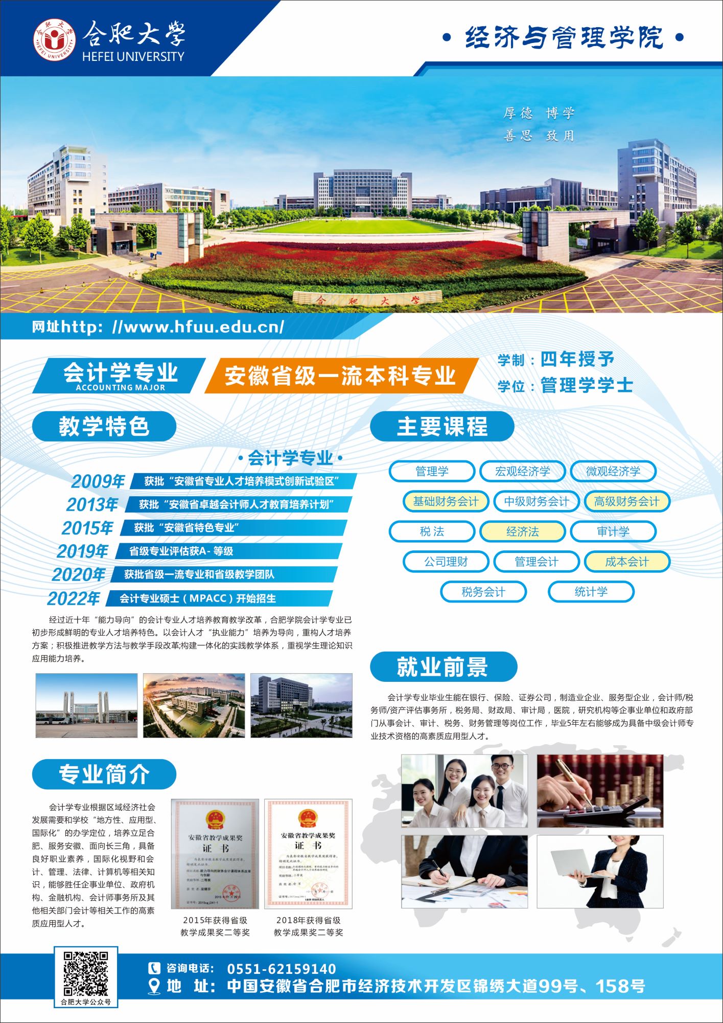 畢業生發展方向:畢業生可在生產型企業,商品流通企業,銀行、證券、保險等金融企業,會計師事務所等專業服務機構以及行政事業單位從事會計、財務管理、成本管理、審計或專業咨詢、服務等工作;也可繼續攻讀碩士學位研究生或出國深造。