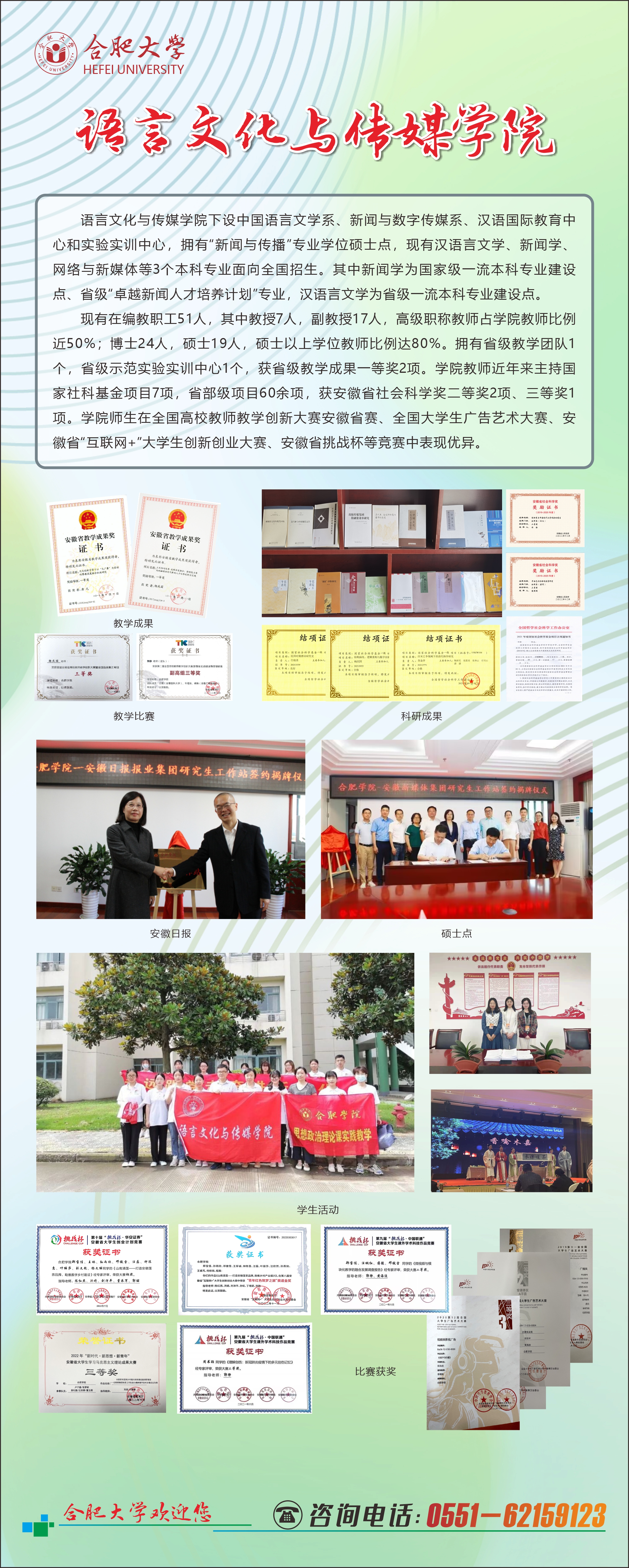 語言文化與傳媒學院現有漢語言文學、新聞學和網絡與新媒體3個本科專業。其中漢語言文學專業是省級一流本科專業建設點、省級專業升級改造項目。新聞學專業獲批國家級一流本科專業建設點、省級“六卓越一拔尖”項目建設專業,同時擁有1個省級教學團隊。網絡與新媒體專業是順應信息時代發展、媒介融合趨勢要求而開設的新興專業。學院現有1個省級示范實驗實訓中心、1個省級實踐教育基地,2次獲省級教學成果一等獎,1次獲省級教學成果二等獎,獲安徽省高校教師教學創新大賽省賽二等獎1項、三等獎3項。學生多次在全國大學生廣告藝術大賽、安徽省大學生原創文學新星大賽、安徽省大學生微電影大賽等各級各類賽事中獲得優異成績。畢業生就業率每年均在95%以上,參加研究生和公務員、選調生等各類考試的錄取率接近30%。