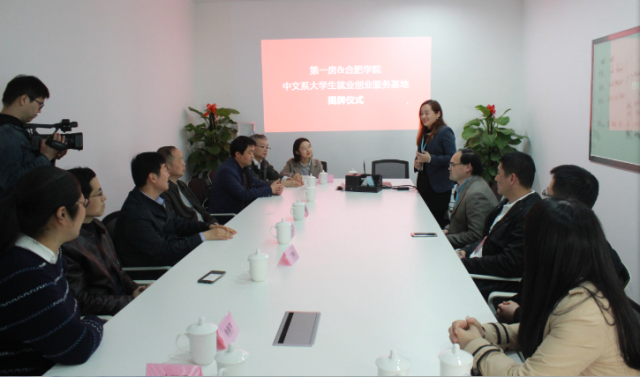 董承軍一行人走訪的第一站為“第一房”公司,一個以成為一站式新媒體營銷平臺為口號的創業企業。在會議室,企業負責人向到訪的一行人介紹了企業有關事項,中文系黨總支書記朱濤表達了對企業的認可,之后在大家的見證下舉行了中文系大學生創業合作基地揭牌儀式。