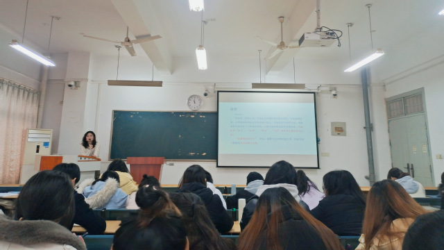大會(huì)中,殷明明老師首先向大家介紹了畢業(yè)論文撰寫的整個(gè)流程,包括選定指導(dǎo)老師,確定選題,提交開題報(bào)告,復(fù)審,抽查以及答辯等步驟。然后,殷明明老師給大家講解了一些細(xì)節(jié),比如查重比重、送至外審的比例等,要求大家誠信寫作。之后,殷明明老師向大家強(qiáng)調(diào)了畢業(yè)實(shí)習(xí)的要求和紀(jì)律。