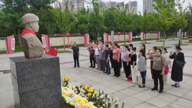 在紀念館前,學院黨委書記儲昭輝帶領全體教工黨員重溫了入黨誓詞,再度感受作為一名共產黨員的責任感和使命感。